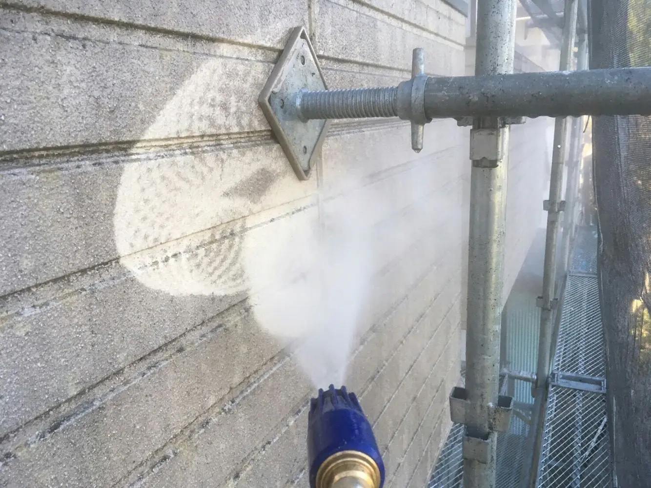 前回までに足場立てや、防護ネット張りなどが完了しましたので、今回は引き続き外壁の洗浄作業を行ないたいと思います。