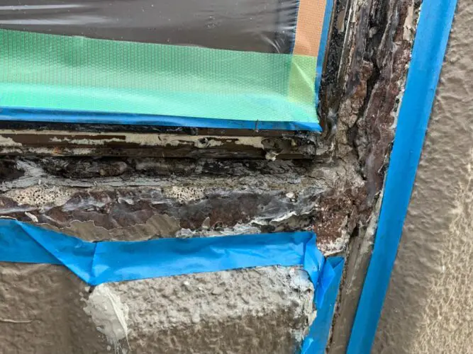 既存の状態はサッシのコーキングが劣化し、周りの塗装も剥がれてしまっていました。