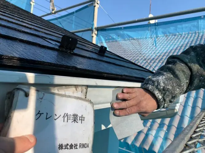 神奈川県伊勢原市 屋根・外壁塗装工事 軒樋 ケレン〜下塗り〜上塗り